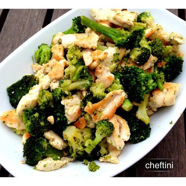 Sauteed chicken and frozen broccoli florets with chopped garlic and a splash of vermouth (or dry white wine).Ingredients