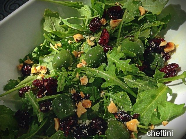 Arugula Salad with Hazelnuts, craisins, and Castelvetrano Olives