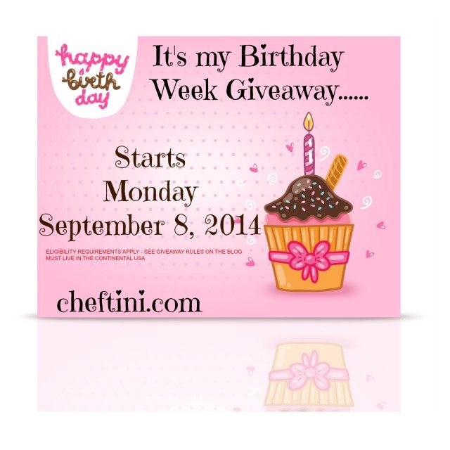 More details on my Birthday Giveaway Bash will be posted this week so make sure you are getting emails and notifications from Cheftini.com and the Cheftini Facebook Fan Page.