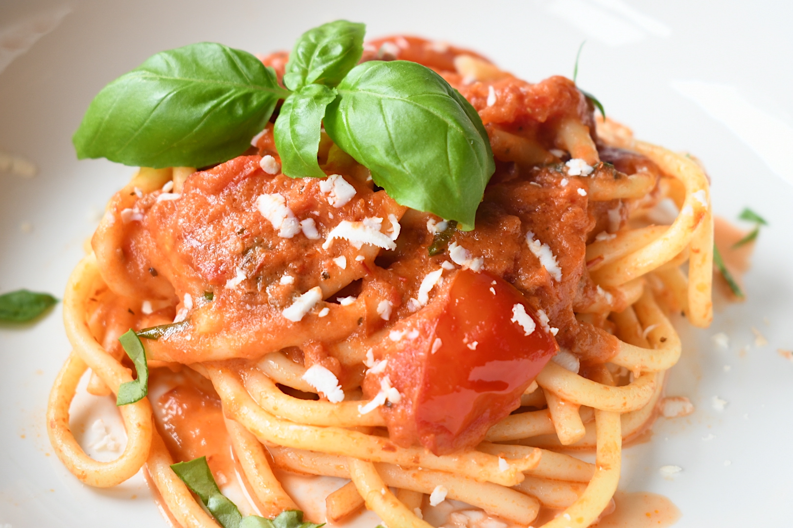This recipe is for a Bucatini with Pomodoro Sauce is made using a combination of fresh and canned tomatoes, garlic, fresh basil and just a hint of cream.