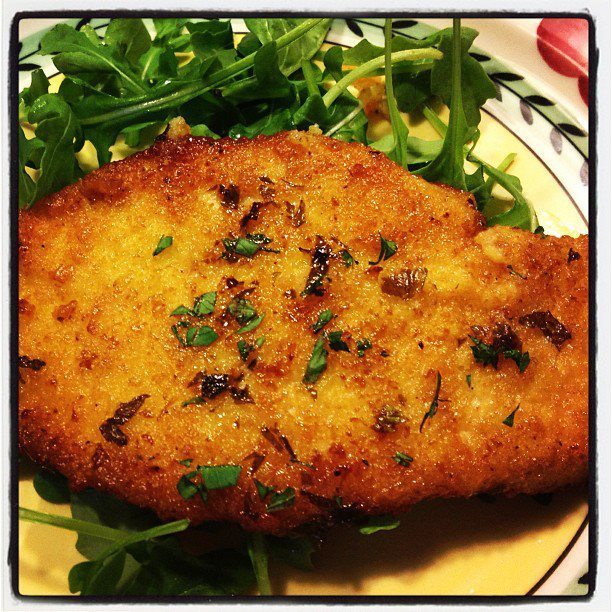 Growing up and living in a predominantly Italian-American area has its advantages. Most of which include an over abundance of Italian restaurants. In my town alone I can think of 6 right of the top of my head. Each one is uniquely good and has one or two known specialties. One of our favorite local restaurants serves a chicken breast crusted in parmesan cheese that is nestled among a delicious lemon-white wine sauce. Although it’s not what most people consider to be an Italian chicken dish it is a refreshing and delightful meal.