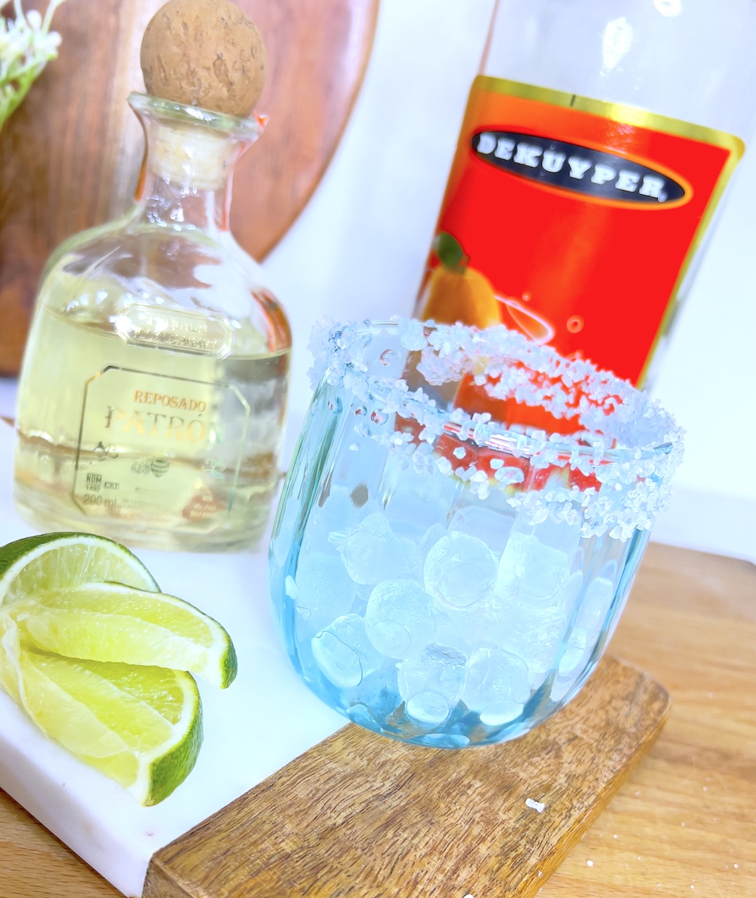 To get started you are going to want to rub the rims of your cocktail glass(es) with a piece of cut up lime and then dip into Margarita salt. If making a bigger batch you should rim all your glasses to be set up and ready to go.