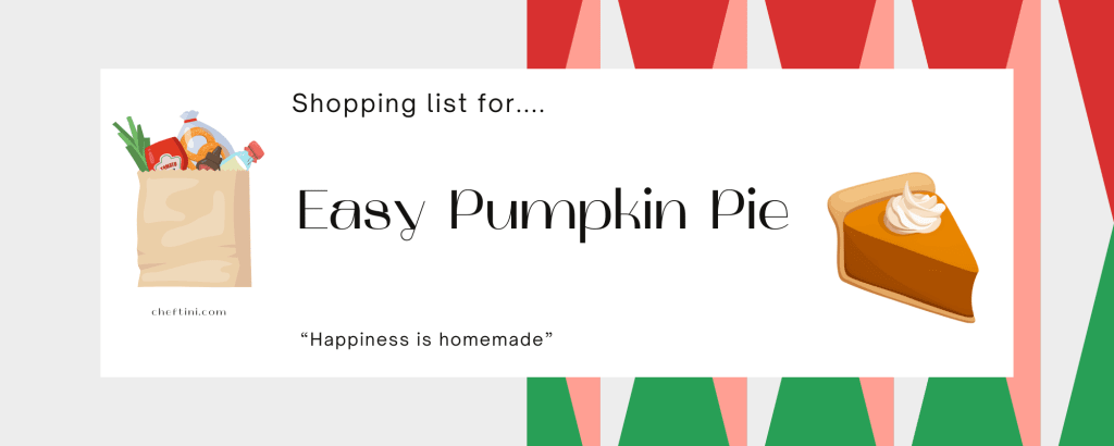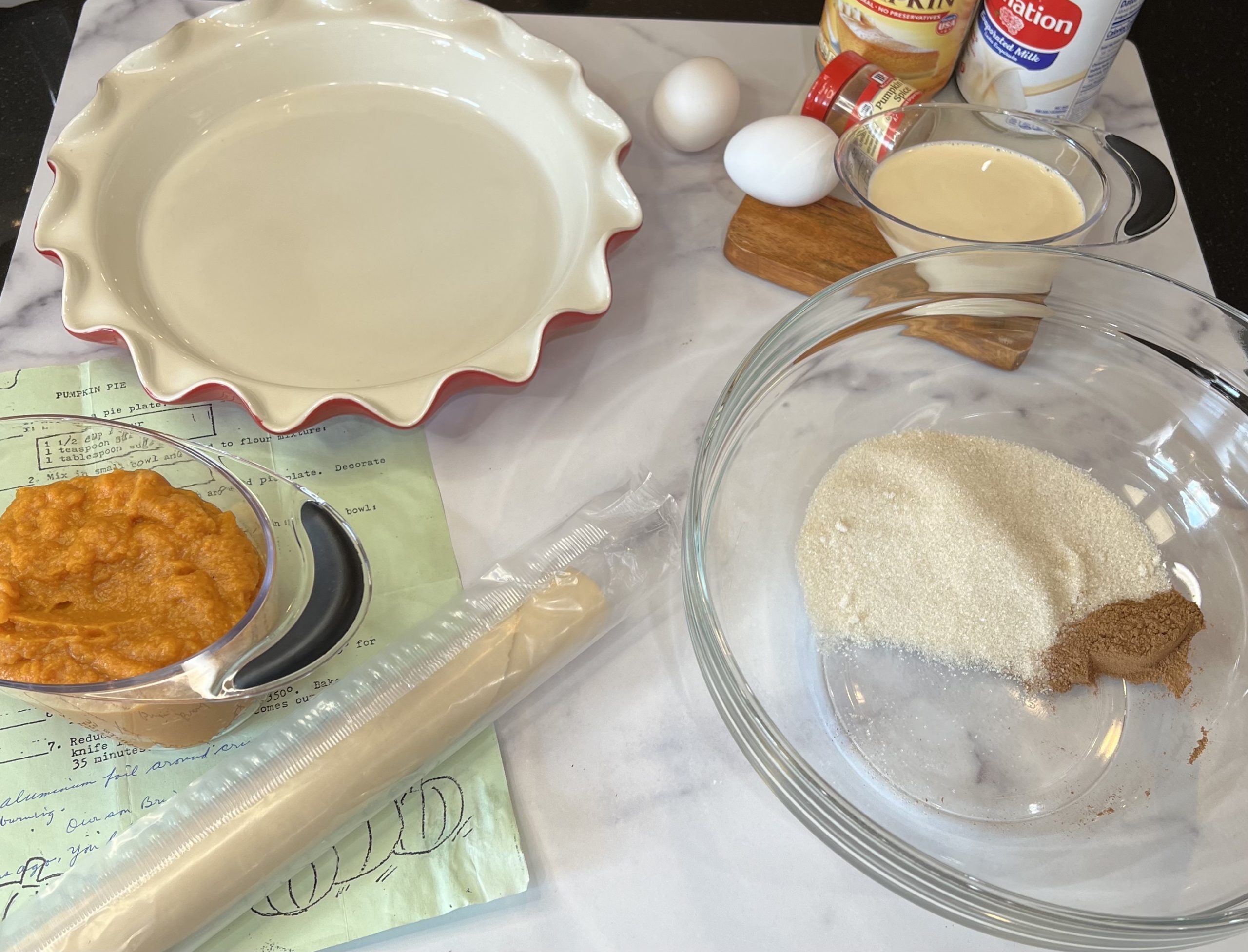1 can of pumpkin puree (like Libby’s) Carnation Evaporated Milk Large eggs Granulated Sugar Pumpkin Pie Spice Pre-made pie crust Whipped Cream