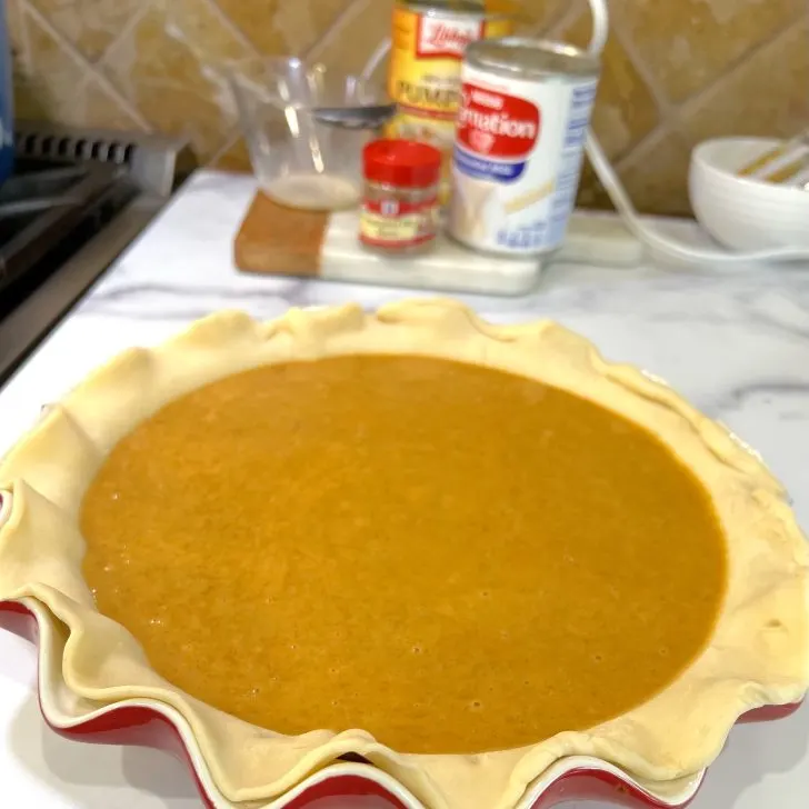 The next step is to pour the mixture into the pie crust and is now ready to be placed into the preheated oven.