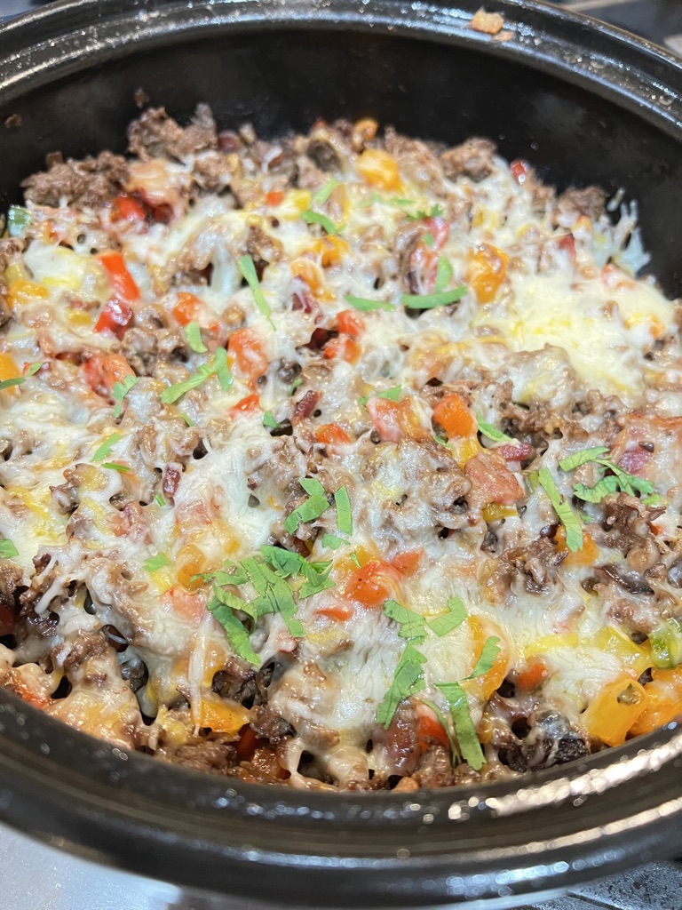 Easy one pan Taco Dinner made with shaved steak, savory bacon, crunchy peppers, and tender onions.