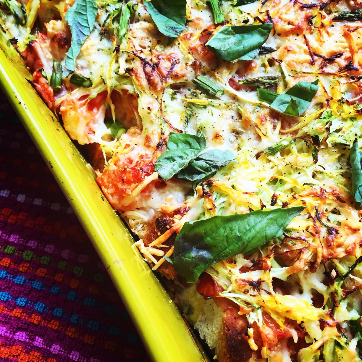 - Add prepared Zucchini,summer squash, asparagus on top of tomatoes and sprinkle some more salt and pepper( it's important to season every layer). Sprinkle cheese blend on top. Bake at 350 for approx 30-35 mins till top is brown and cheese is melted. Remove and let sit for about 10 mins. Add some torn fresh basil on top and serve.