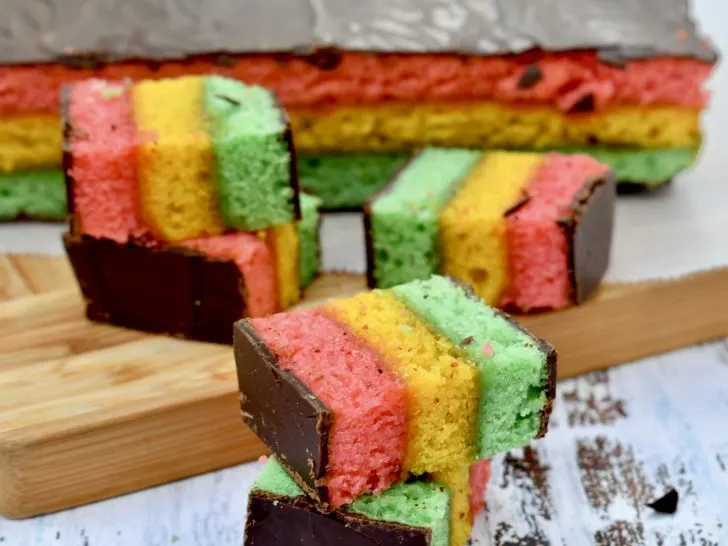 Italian Rainbow Cookies, also known as Tri-Color Cookies, are a delightful treat made up of three layers of almond cookie, with jelly sandwiched in between and a chocolate coating on the top and bottom (sometimes just on the top). Commonly referred to as tri-color cookies among Italian Americans, they often resemble the colors of the Italian flag: red, white, and green. Growing up, we called them tri-color cookies, but over time, they’ve also been affectionately dubbed rainbow cookies and even seven-layer cookies.