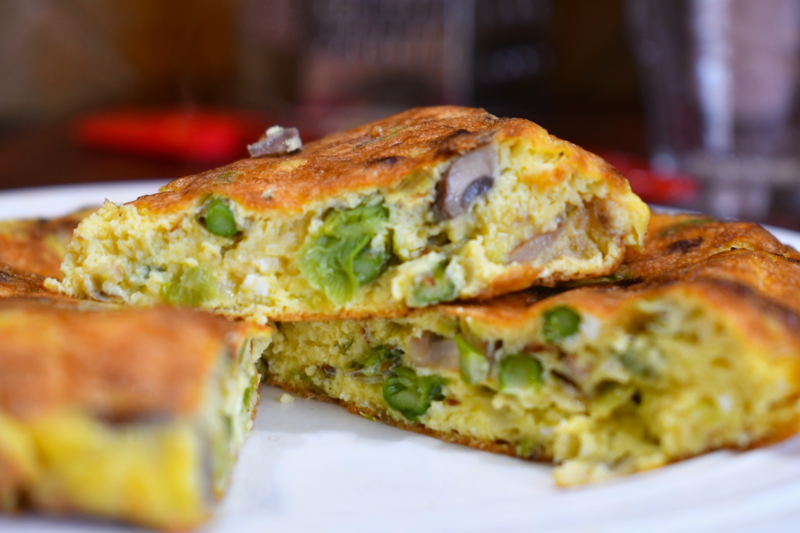To finish up the dish, the egg mixture is poured into a greased, non stick skillet and cooked through on both sides. When cooked through just transfer to a dish and serve warm.