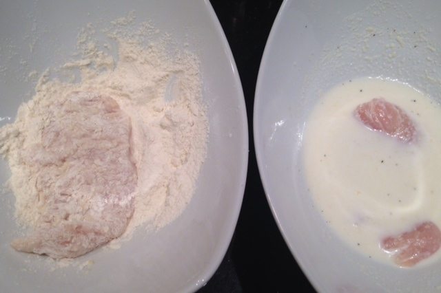 It’s a thin piece of chicken coated in milk, parmesan and flour.