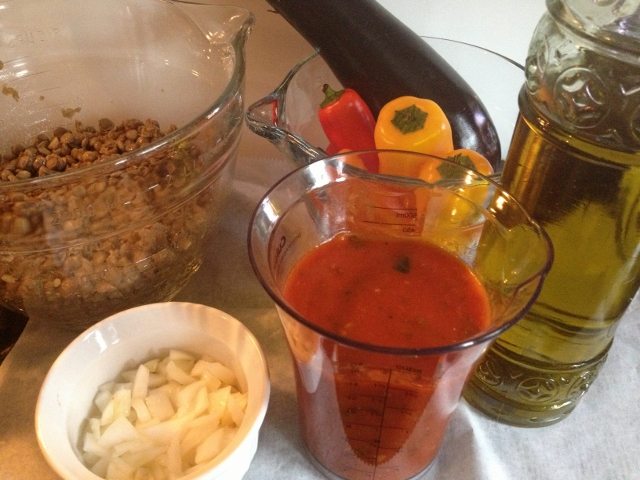 - Ingredients: lentils,mini eggplant,mini peppers,olive oil, garlic, onion and tomato sauce