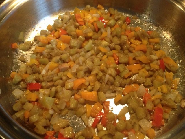 - Saute onion, garlic, eggplant and pepper in olive oil and season with salt and pepper