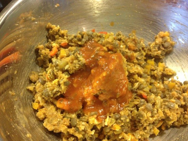 - Add egg and a little more sauce and combine with your hands to really blend the mixture together