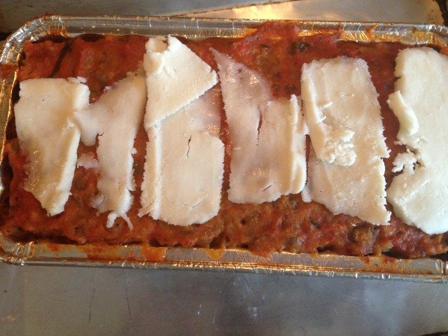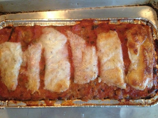 - After about 45 minutes remove from oven and let cool. Once cooled slice and serve with extra sauce and cheese (if desired). Should yield between 6-8 slices.