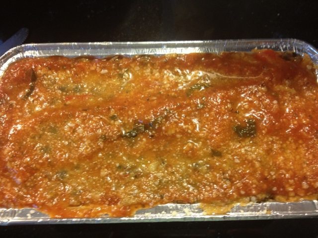 - Top layer is sprinkled with parmesan cheese and a few tablespoons of sauce then covered with foil and placed in a preheated oven to cook.