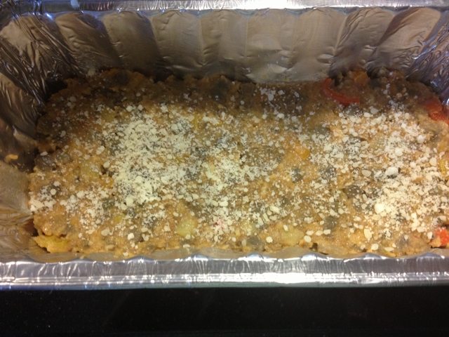 I actually gave this meat free meal a try a while back using lentils, eggplant and breadcrumbs. It was good but was missing something. After a little tweaking I gave it more of a Mediterranean flare and added some color and texture with peppers, tomato sauce, parmesan and mozzarella cheeses. I mixed it all together and then layered it in a loaf pan. Similar layering concept of lasagna or eggplant parmesan.
