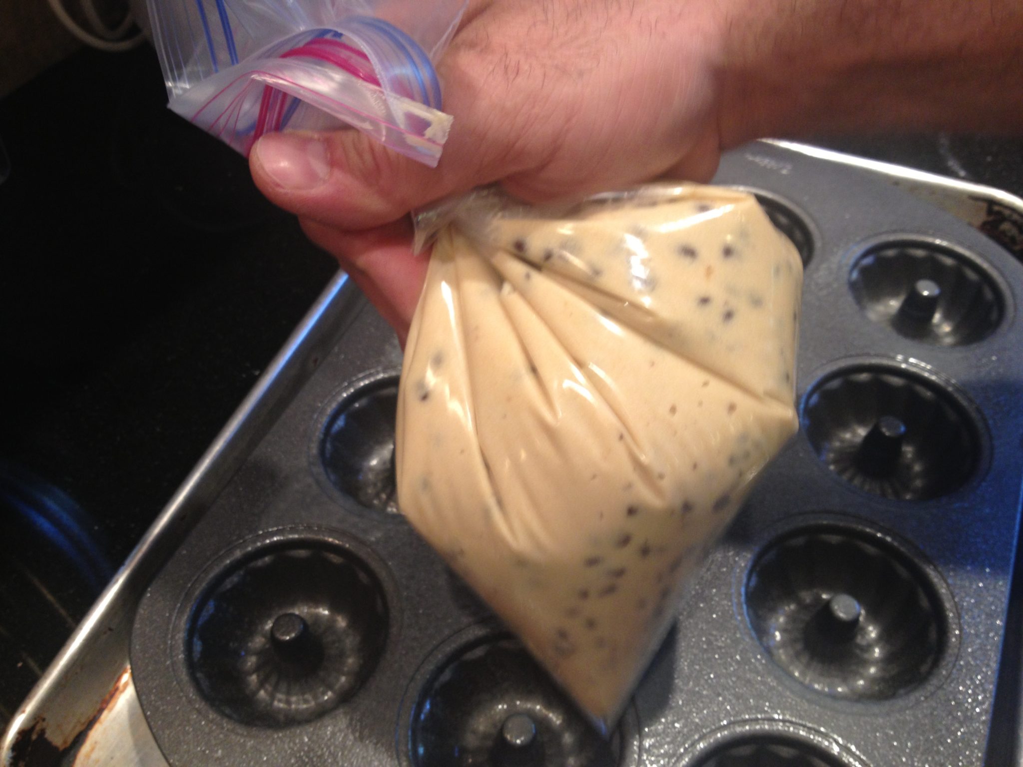 TIP: For a little less mess you can place the batter into a self sealing plastic bag like I do. I prefer this method. My husband helped me hold the bag while I filled it with batter, but if you don’t have a sioux chef like me, then you can place the ziplock into a tall cup and fold it over the rim of a glass…..