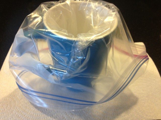 - Fold top of the bag over the sides of the cup. Pour the batter into the bag.