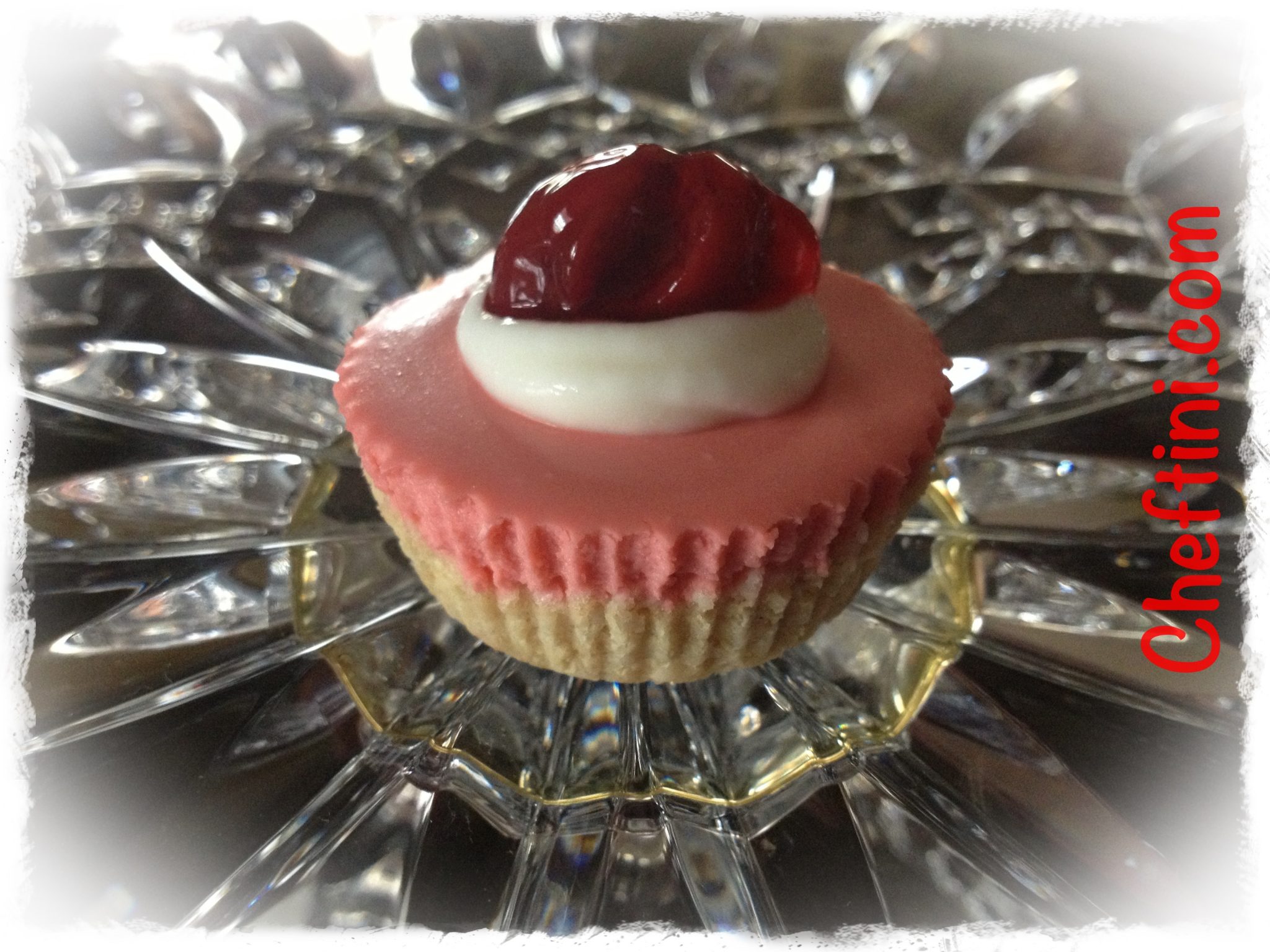- Squezzed a dollop onto each cheesecake and placed a cherry on the top. I cut the cherries into 1/4’s ( I used whole country style cherries and then cut them).