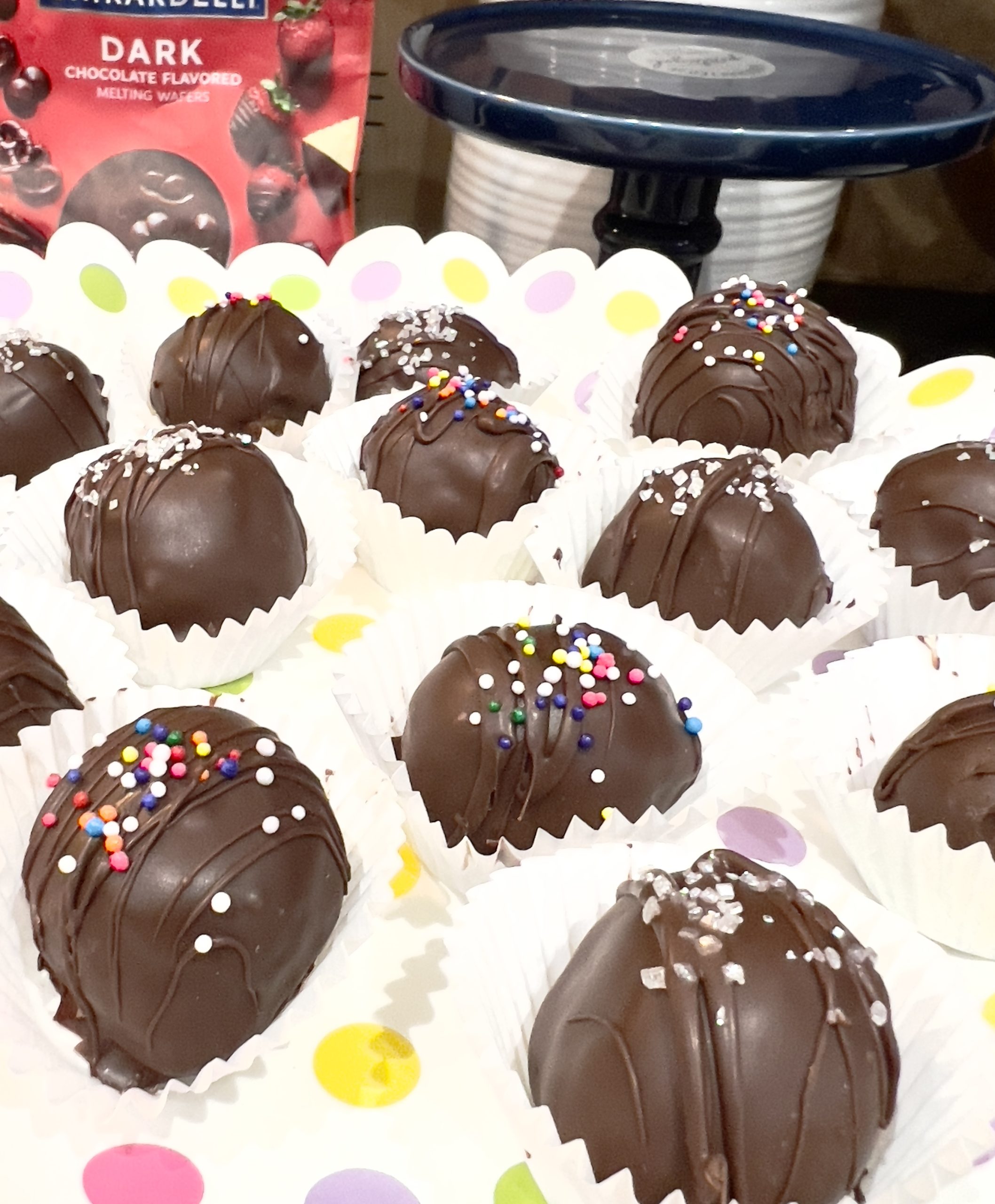 - Place the Nutella balls into mini paper candy cups. Lightly drizzle them with chocolate and then decorate with sprinkles or crystallized sugar. Refrigerate until ready to serve.