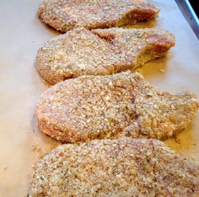 For the breading use a mixture of both panko and regular breadcrumbs. Before coating each chop with the bread dip into an egg wash mixture of egg, water and grated parmesan cheese.