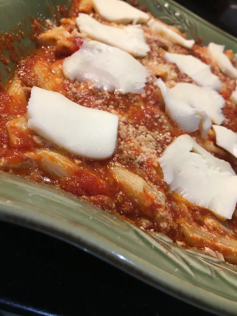 • Layer in the remaining pasta, add more sauce and parmesan cheese. Evenly Layer the sliced mozzarella over the top. Cover with foil and bake in a preheated 375 degree oven for 30-40 minutes. Remove the foil and continue bake an additional 15 minutes or until the cheese on top begins to bubble. Remove and let sit before serving.