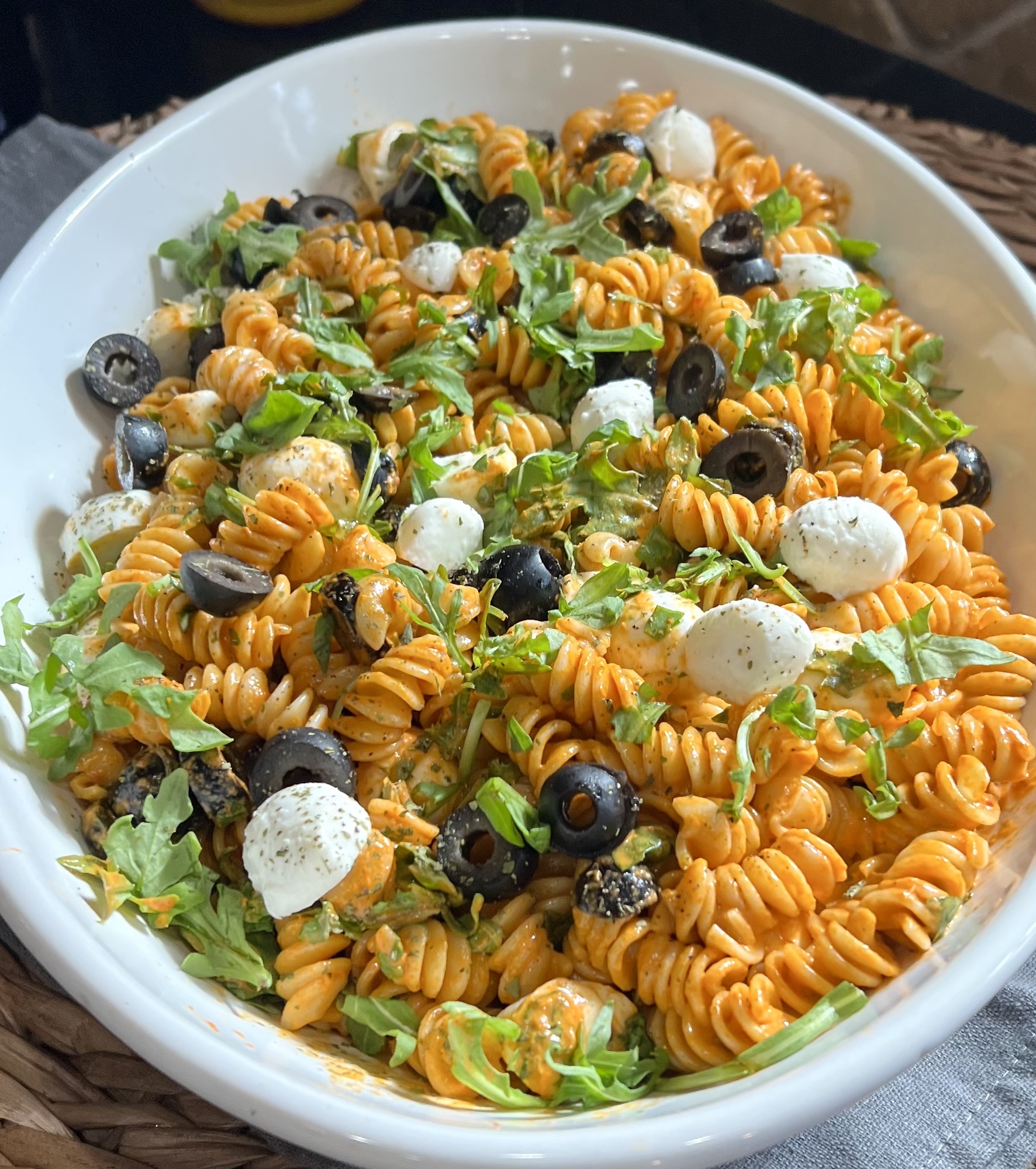 - Cook pasta according to package directions. Drain. Let cool with a few Tblsp. Olive oil mixed in to prevent sticking. Mix in roasted pepper sauce. Add olives and mozzarella. Rough chop arugula and add to pasta salad right before serving. Refrigerate over night. Serve cold. YUM!