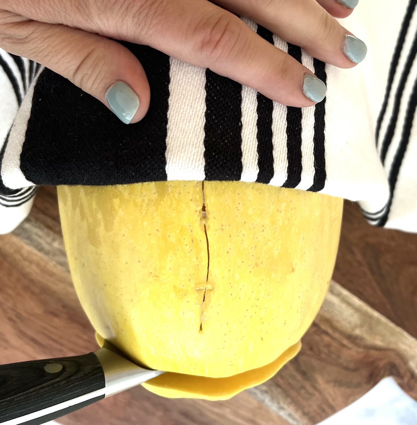 WARNING the squash does get hot so hold the squash in place using a kitchen towel.