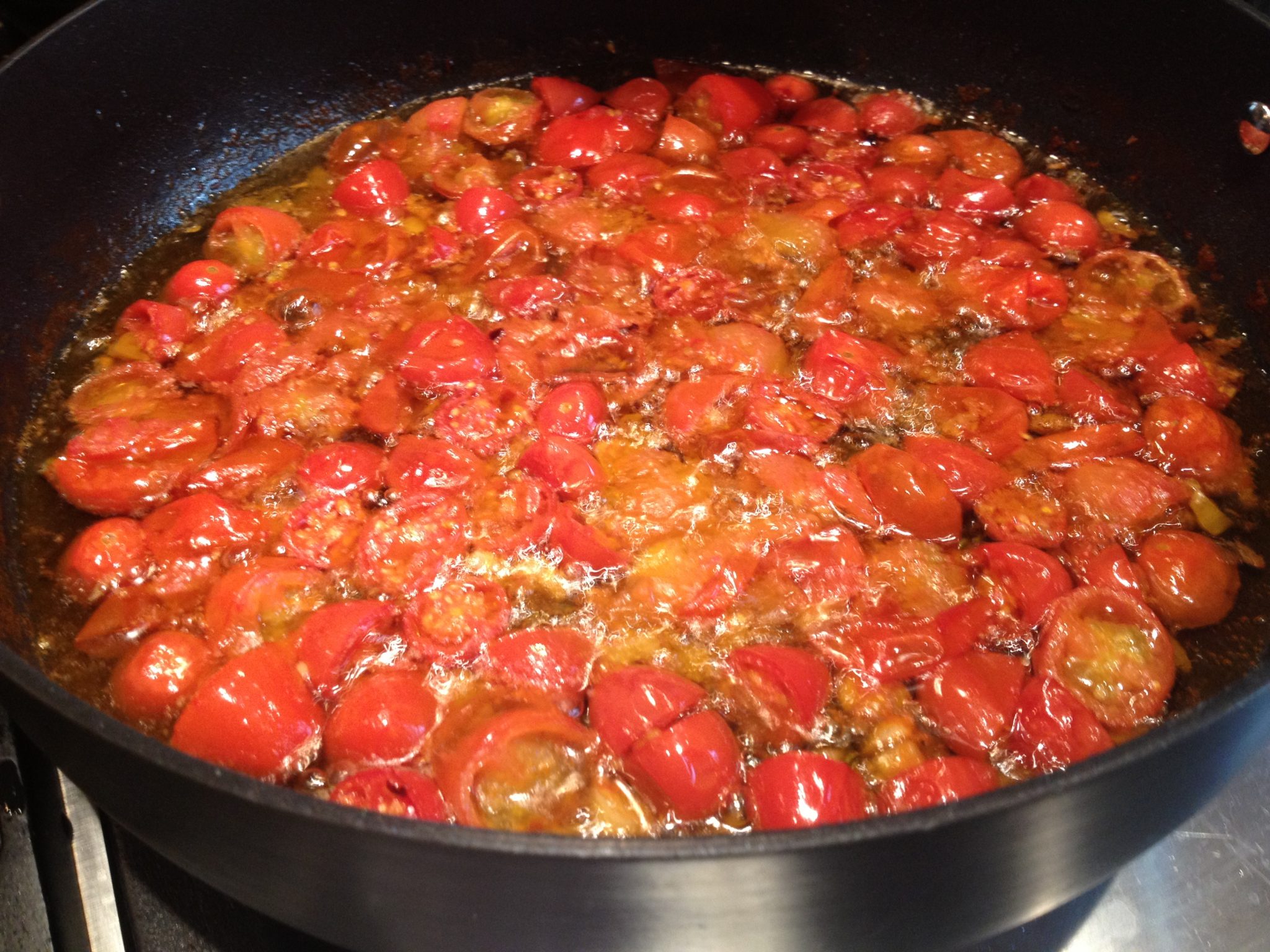 - Over Medium heat olive oil in a large sauté pan with crushed garlic and red pepper flakes. Once garlic begins to turn brown add grape tomatoes and sauté another 5 minutes. Salt and pepper to taste. Cover pan for remaining 10 minutes or until tomatoes have softened.You can press on them slightly with a potato masher or a fork to help them release their juices. Add fresh parsley or basil and toss through the mixture.