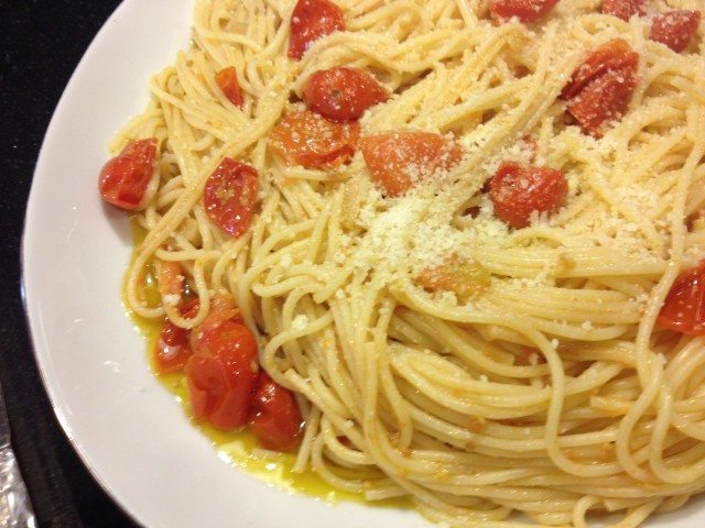 Not only is this dish quick, it has only a few ingredients and isn’t difficult to make. By keeping stock of certain items in my refrigerator and pantry, I usually have ingredients on hand to pull together a homemade meal. In this dish I pulled out spaghetti, grape tomatoes, garlic, red pepper flakes and grated Parmesan cheese. These are all ingredients I keep on hand in my pantry and refrigerator. I think I’ve mentioned before that I try to keep cherry/grape tomatoes on hand because they are flavorful and very versatile.