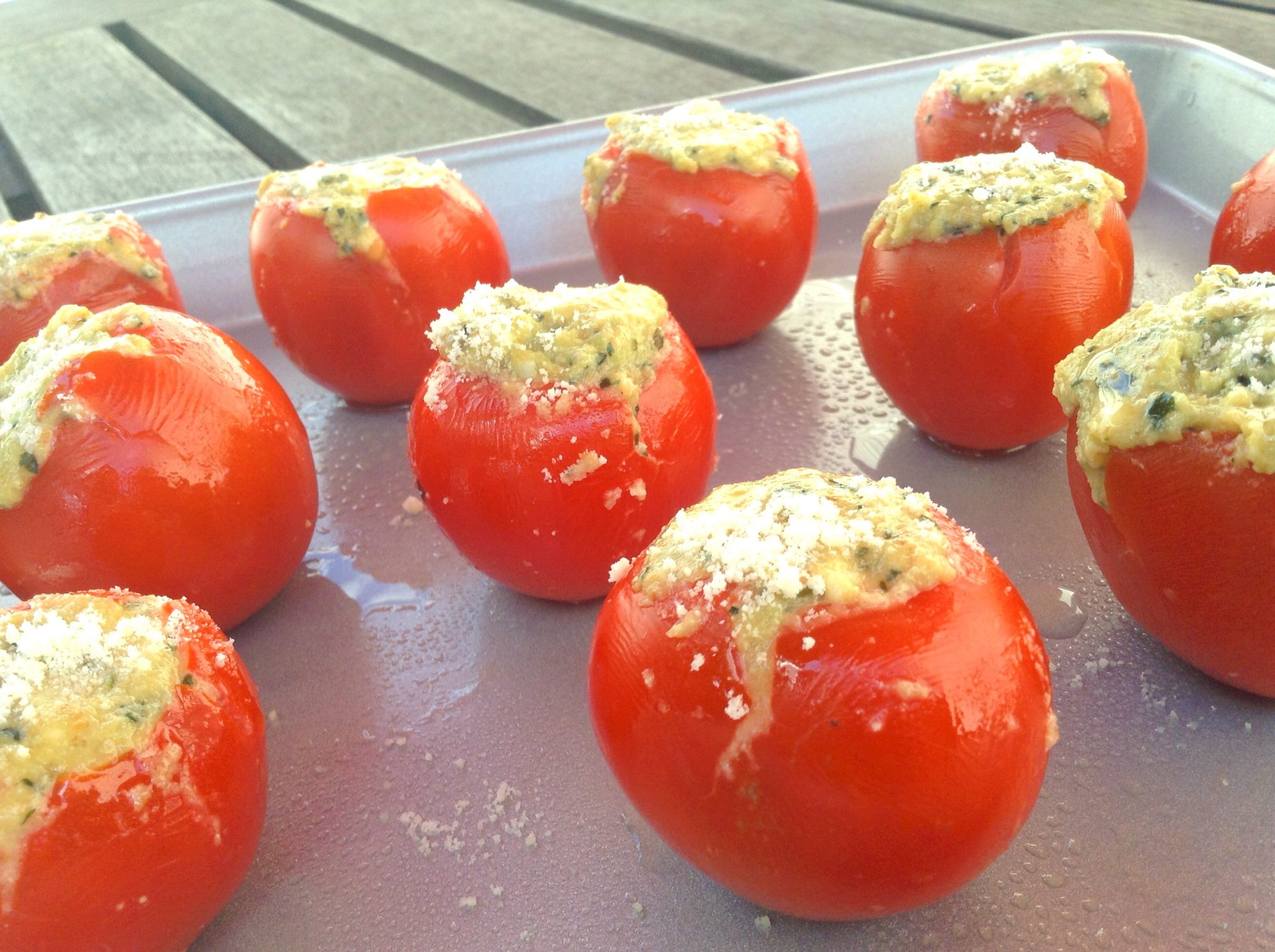 It’s tomato time and I love tomatoes! Especially campari tomatoes. These tomatoes are the perfect size and shape for stuffing and roasting.
