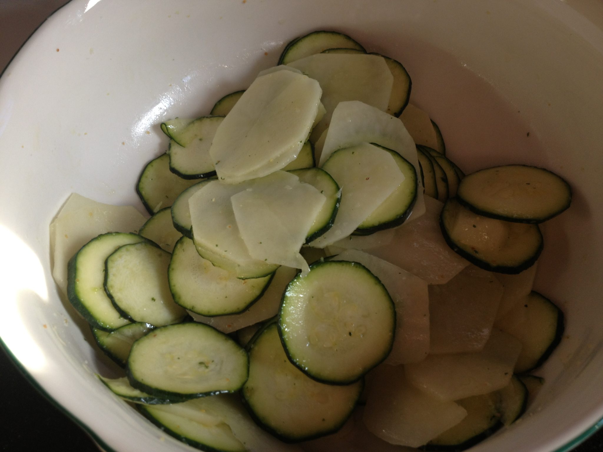 Side Note: I happen to be married to one of the pickiest eaters on the planet so I also sliced a potato – my dear has never met a vegetable he will eat ( unless you count corn and potato – crazy right?!) I keep telling him to hand over his Italian ID!